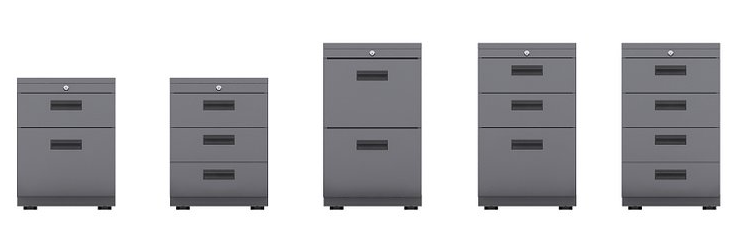 Disponibles en versiones con y sin ruedas , dos cajones un kadex , 4 cajones , alturas inferiores con 3 cajones , o dos cajones un kardex , todas con o sin cubiertas , disponibles también en versiones sin frente , correderas telescópicas o convencionales , sistema de cierre centralizado o lateral